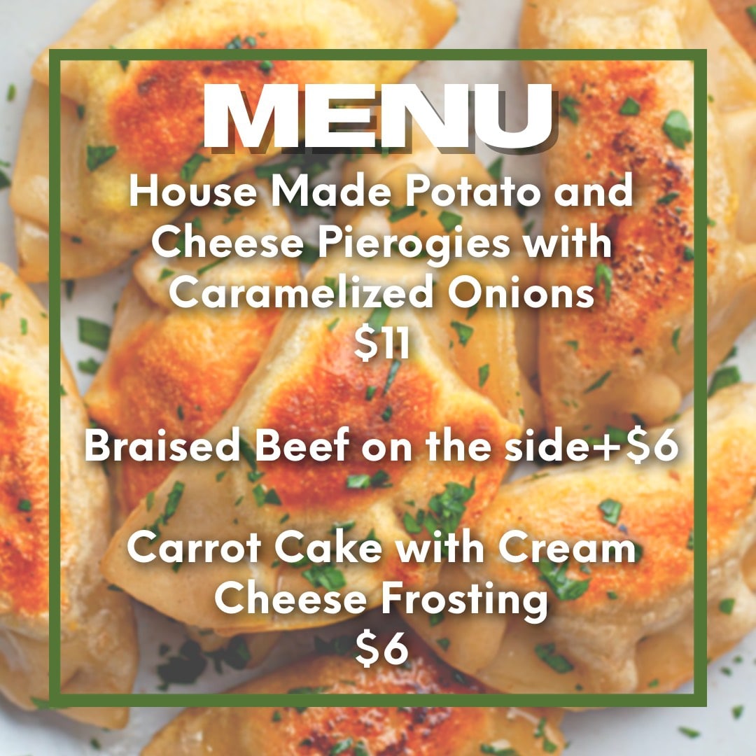 Handmade potato and cheese pierogies a classic midwestern favorite with caramelized onions. You can also add braised beef to your and don't forget dessert carrot cake with cream cheese frosting.