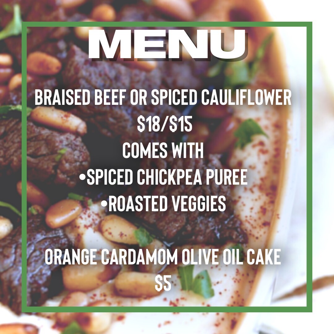 ***All orders will be delivered on Thursday the 22nd*** Choose between beef braised with garlic ginger and warm spices or spiced and roasted cauliflower. Comes with braised and spiced chickpea puree and a mix of roasted veggies.